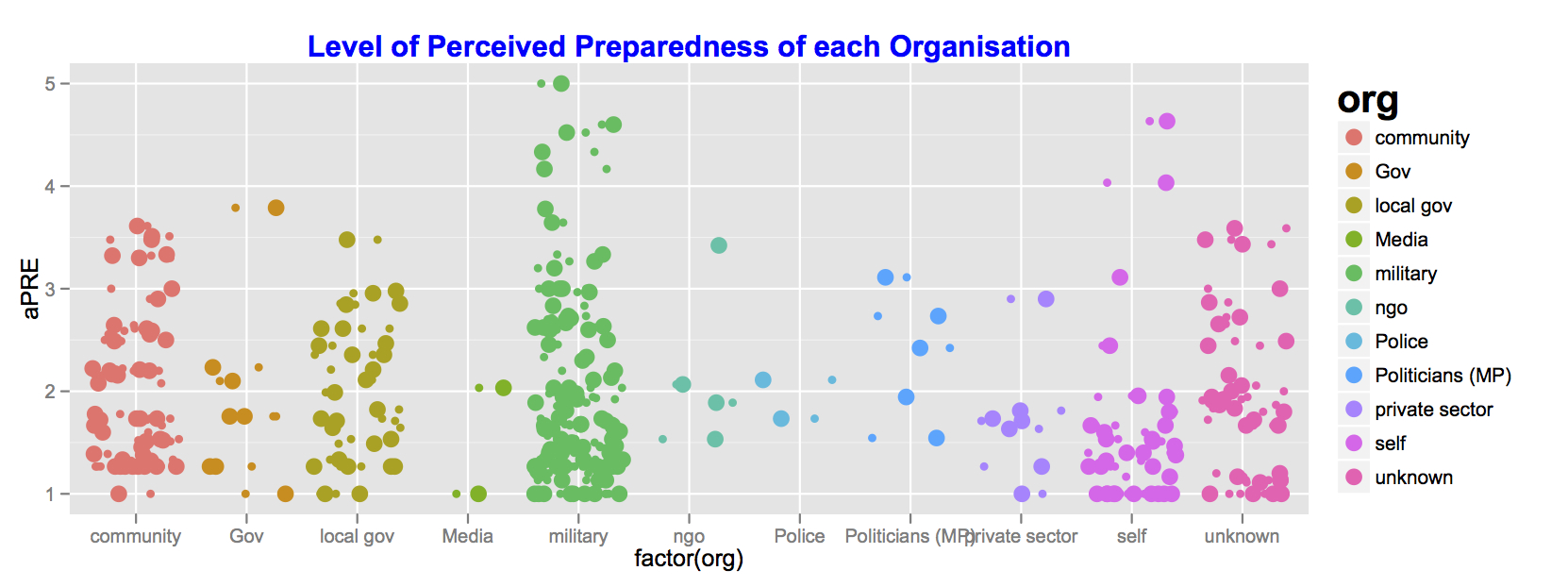 # Boxplot preparedness performance k <- ggplot(flood, aes(factor(org), aPRE)) k + geom_jitter(aes(colour = org), size = 4) + opts(legend.title = theme_text(size = 20, face = "bold"), legend.text = theme_text(size = 10)) + opts(title = "Level of Perceived Preparedness of each Organisation") + opts(plot.title = theme_text(size = 15, face="bold", colour = "blue"))