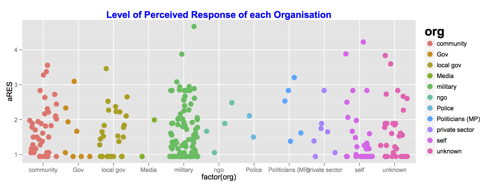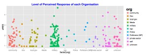 # Boxplot response perforance c <- ggplot(flood, aes(factor(org), aRES)) c + geom_jitter(aes(colour = org), size = 4) + opts(legend.title = theme_text(size = 20, face = "bold"), legend.text = theme_text(size = 10)) + opts(title = "Level of Perceived Response of each Organisation") + opts(plot.title = theme_text(size = 15, face="bold", colour = "blue")) <pre>