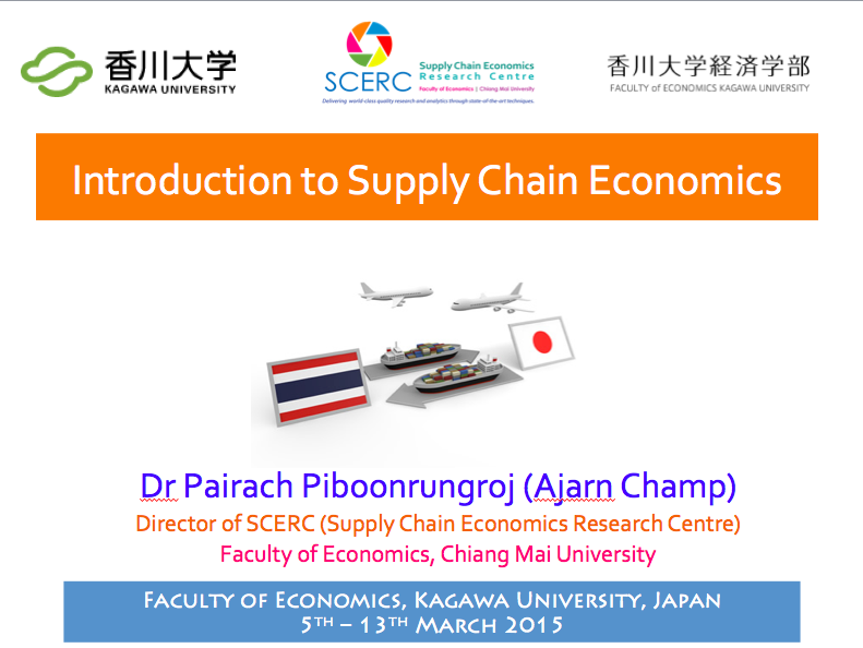 My university, Chiang Mai University (Thailand), has a great relationship with the Kagawa University of Japan. We have a dedicated annual academic conferences where faculty from both universities exchange idea and knowledge. Also our students can also gain a great experience by visiting each other. I think this is a unique relationships two academic institutes may have. My contributions began in 2013 when I had a chance to teach a group of exchange students from Japan. I got second spell with another group in 2014 again in Chiang Mai. In 2015, I was honourably invited by Professor Komsan Suriya and Professor Ranade to teach “Supply Chain Economics” in Japan.