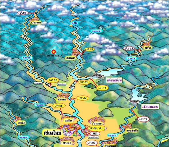 ภาพด้านบนแสดงเส้นทางเดินของกระแสน้ำในจังหวัดเชียงใหม่ เพื่อประกอบการดูตัวเลขระดับน้ำครับ (คณะวิศวกรรมศาสตร์ ม.เชียงใหม่)