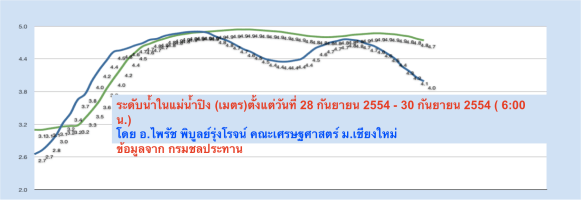 - เที่ยงคืน น้ำปิงที่สะพานนวรัฐลดลงมาอีก เหลือ 4.02 ม. ที่แม่แตก็ลดลงไปอีก เหลือ 3.10 ม.